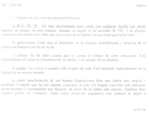 a) B-10, III, 28 [Dieses Kürzel bezeichnet jenen Abschnitt in den Bildungsvorträgen für junge Berufungen, in denen von der Keuschheit die Rede ist]. Entschlossener sein, um mit jedem Detail Schluss zu machen, das in dieser Materie eine Gefahr darstellen könnte. Obwohl es besser geht, ist dennoch II. 542 geschehen, 2 bei einigen Gelegenheiten in diesem letzten Monaten. Er weiß, dass es einer der Punkte ist, in denen er mehr kämpfen muss.