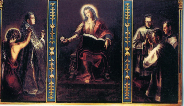 3.- La segunda fotografía tiene más miga. Se encuentra en Villa Tevere y es un cuadro que el propio fundador mandó pintar en la década de los 50, es decir, más de veinte años antes de su muerte y casi 50 años antes de que fuera canonizado. Sin ánimo de juzgar a nadie, sinceramente no me imagino a S. Francisco de Asís, o S. Ignacio o cualquier otro santo mandando a nadie pintar un cuadro semejante.